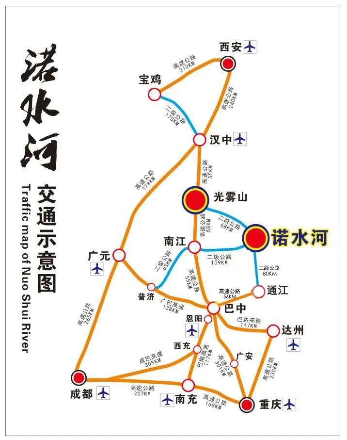 重慶(重慶西站汽車(chē)站、重慶汽車(chē)站、雙鳳橋汽車(chē)站、重慶北站南廣場(chǎng)汽車(chē)站)—通江(通江汽車(chē)站)—諾水洞天景區