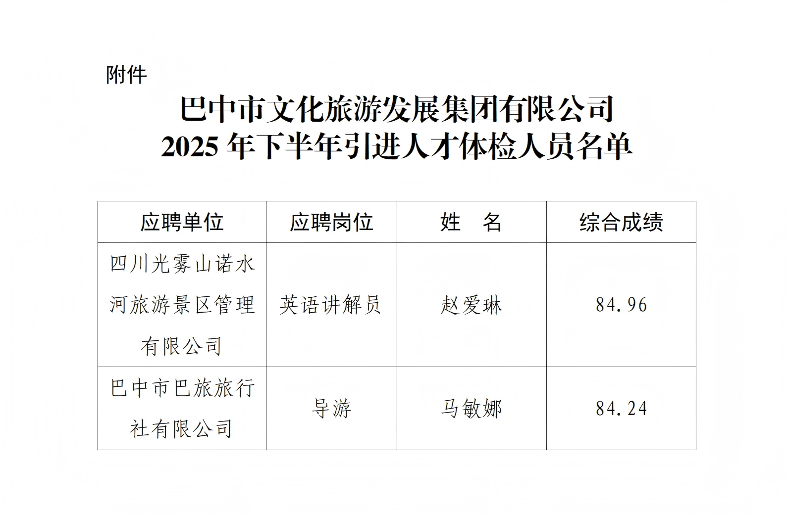 根據市委組織部《四川省巴中市2025年下半年引進(jìn)高層次人才和急需緊缺專(zhuān)業(yè)人才公告》和《巴中市文化旅游發(fā)展集團有限公司關(guān)于2025年下半年引進(jìn)人才資格審查合格人員名單及面試安排的公告》精神,現將引進(jìn)人才進(jìn)入體檢及考察相關(guān)事宜公告如下。